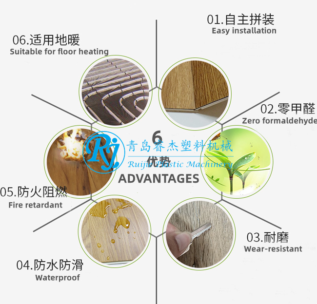 磨粉機,混料機,破碎機,錐形雙螺桿擠出機,地板模具,五輥定型,同步對花,托架,風冷裝置,牽引機,裁斷切割機,全自動機械手碼垛,整線運行穩定,操作簡單,故障率低。